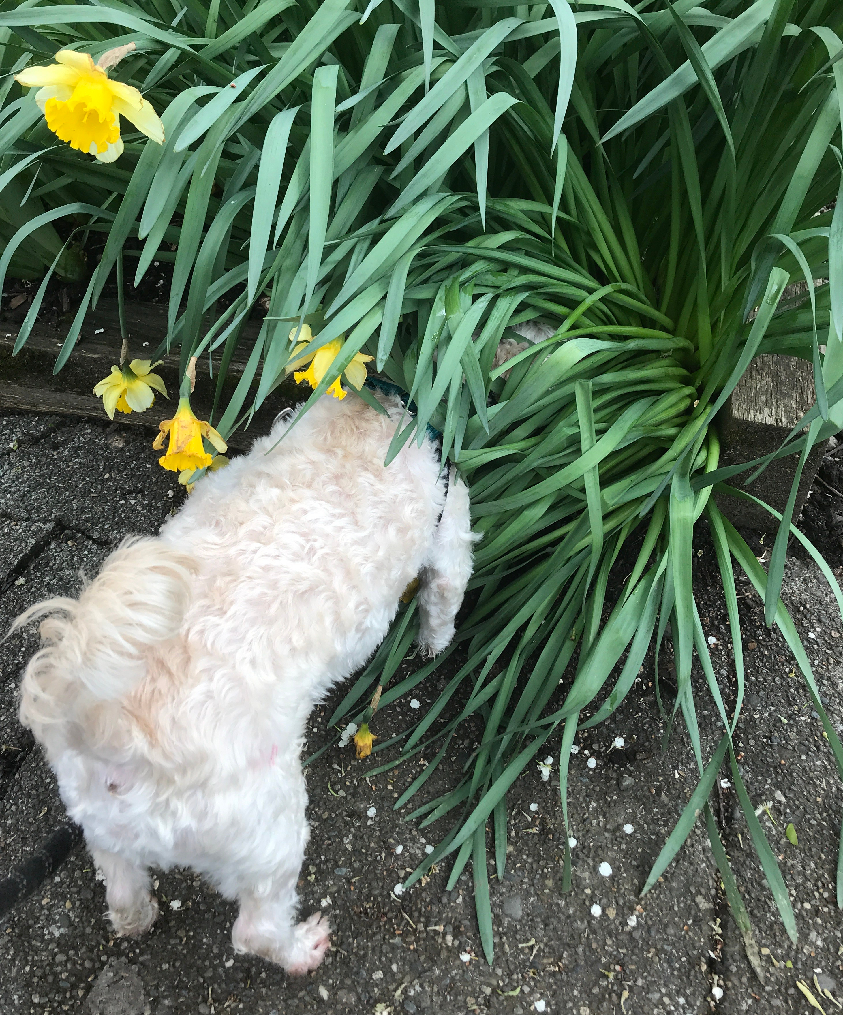 Small White Dog Smelling Daffodils