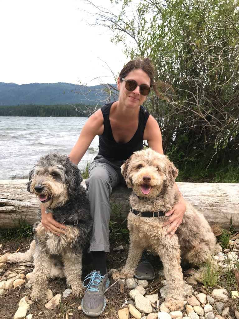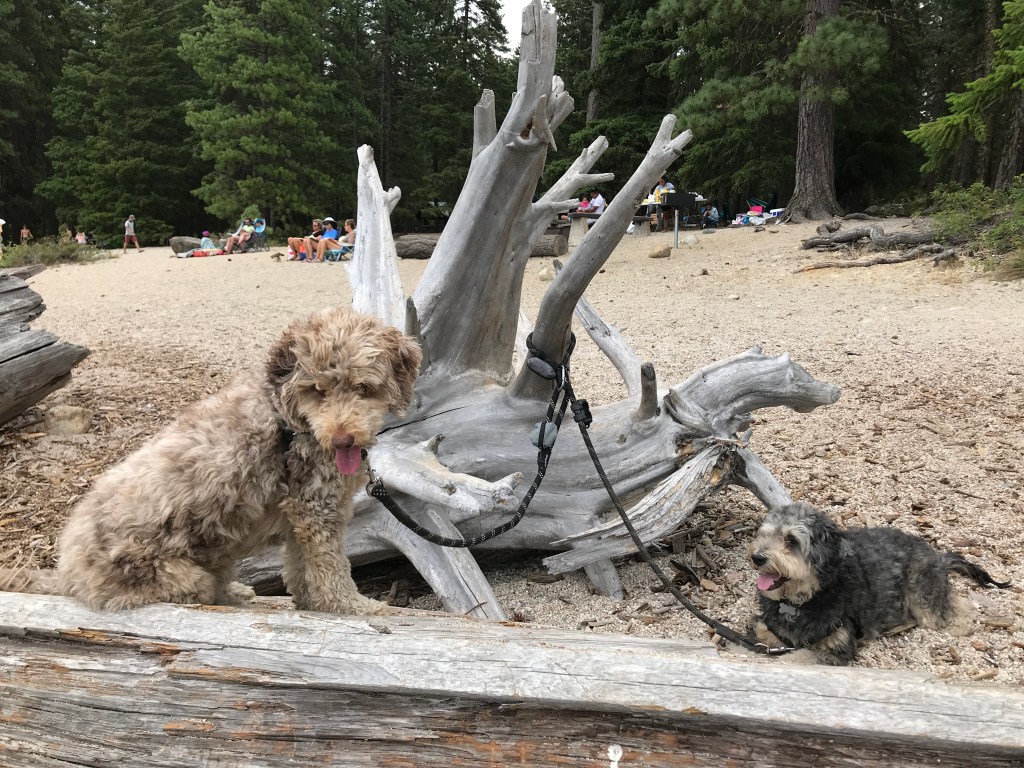 The main beach area had a lot of people but we still found a little spot far enough away from them to be safe. We tied the pups up to this giant piece of driftwood and relaxed while looking at the lake (we were so relaxed I guess I didn’t bother taking a photo of the lake! Oops!)