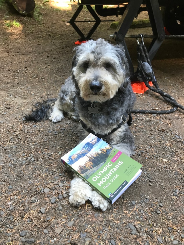 The campsite itself is pretty cramped with sites right next to each other – some of the sites have views of Lake Crescent (ours did not). It’s a fine campground to use as a home base while you explore the Olympic National Park. There quite a few great hikes in the area that are dog-friendly, too. Here Grizzly poses with our copy of the Olympic Mountains Trail Guide: