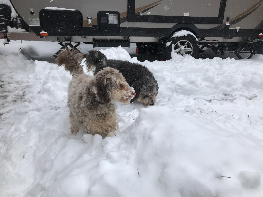 Aussiedoodles (and probably all doodles) have a complicated relationship with snow. First, they absolutely love it. I’ve never seen my dogs as excited as when we get a bunch of snow. They run around the yard in pure ecstasy, frolicking and playing, and then they walk around eating it.