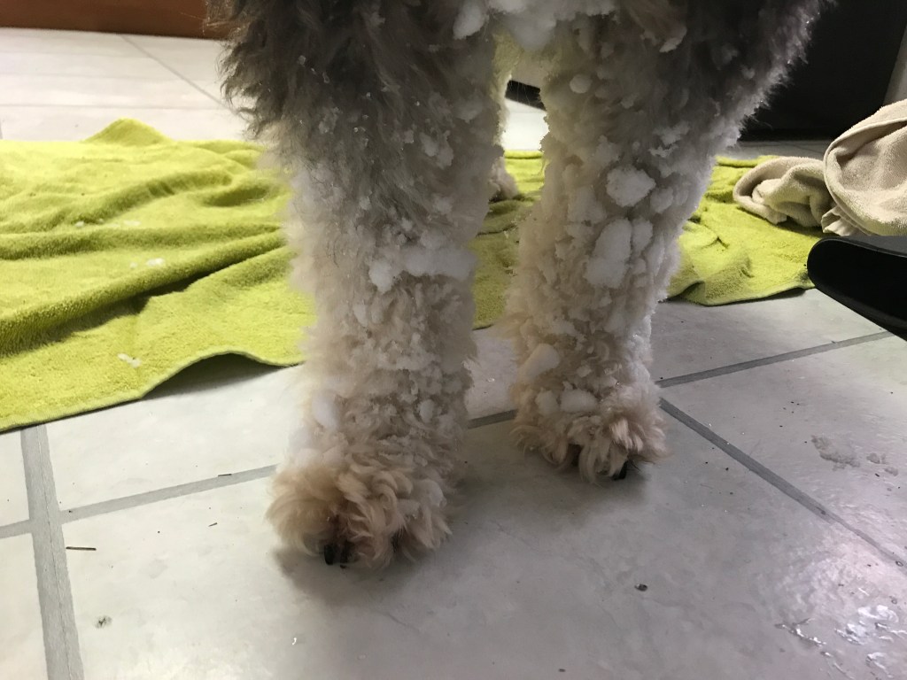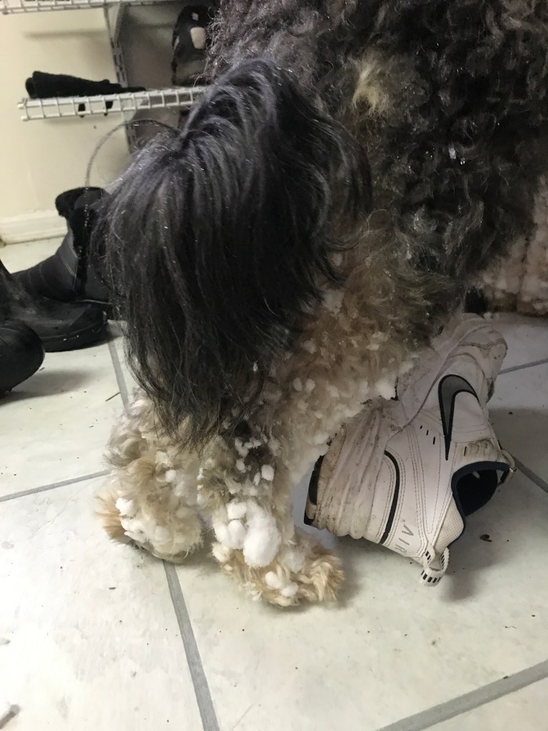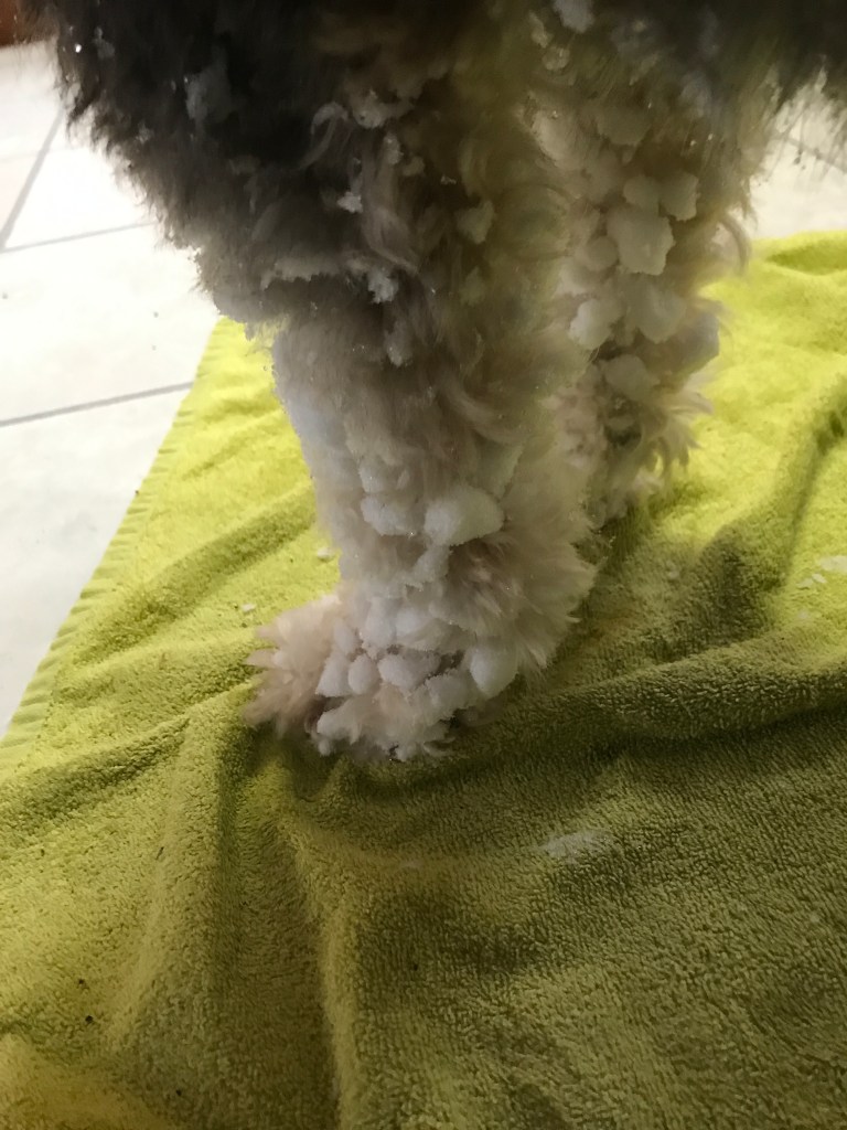 It’s bad enough when it’s on their legs, but in deep enough snow these clumps will form all over their bodies. It takes a vigorous rub down with a towel and sometimes a dog brush to get the clumps of snow out. We can never get all of it, though, so sometimes you just have to wait for it to melt or them to lick it off. Our house gets very wet.