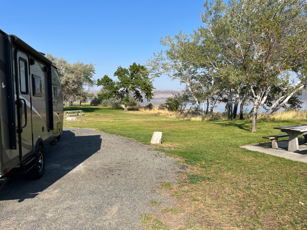 We took our last trailer trip of the season out to eastern Washington for a long weekend and stayed at Wanapum State Park. The trailer section was pretty small but our site was right on the water and absolutely beautiful: