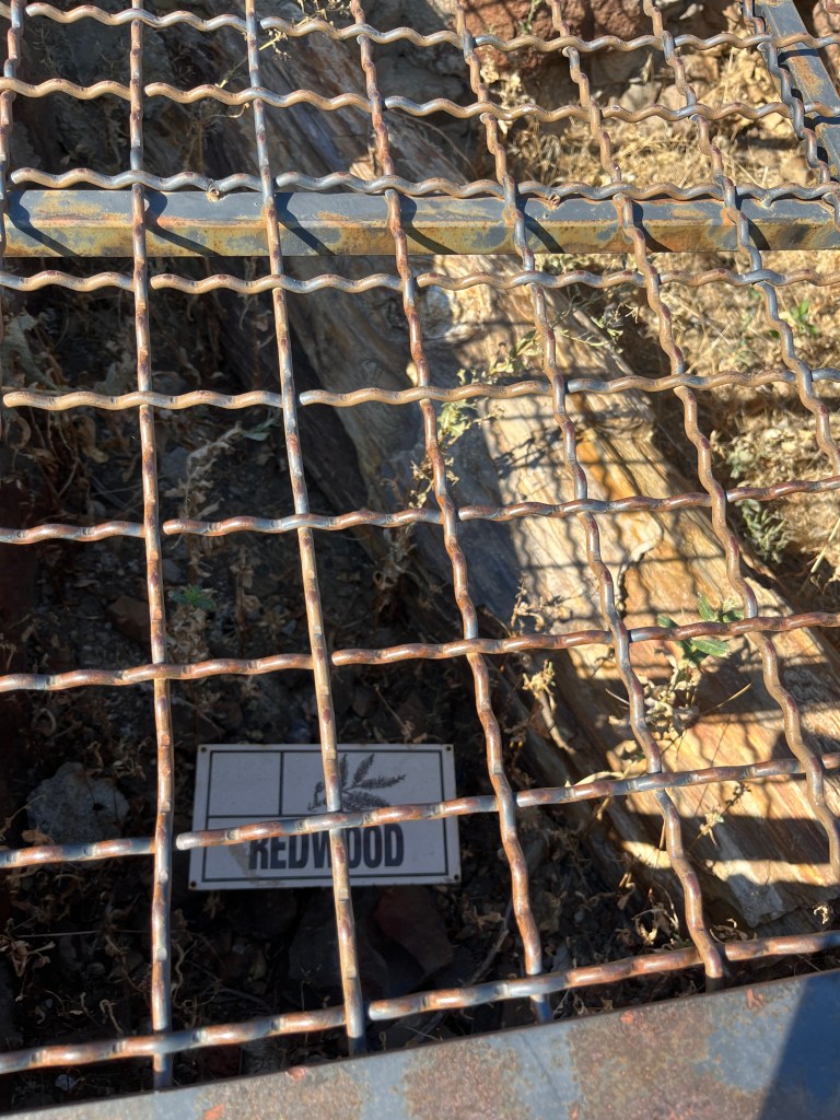 Um, where’s the forest? As far as the eye can see nothing but dead grass. It was hot, ugly, and a huge disappointment. We walked through the Trees of Stone Interpretive trails and saw what the must consider to be the “petrified forest” part. Cages with small chunks of petrified wood inside, like this one: